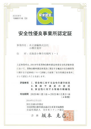 当社は公益社団法人全日本トラック協会より、以下の3テーマの厳しい評価項目に於いて安全性を評価され「安全性優良事業所(Gマーク)」の
